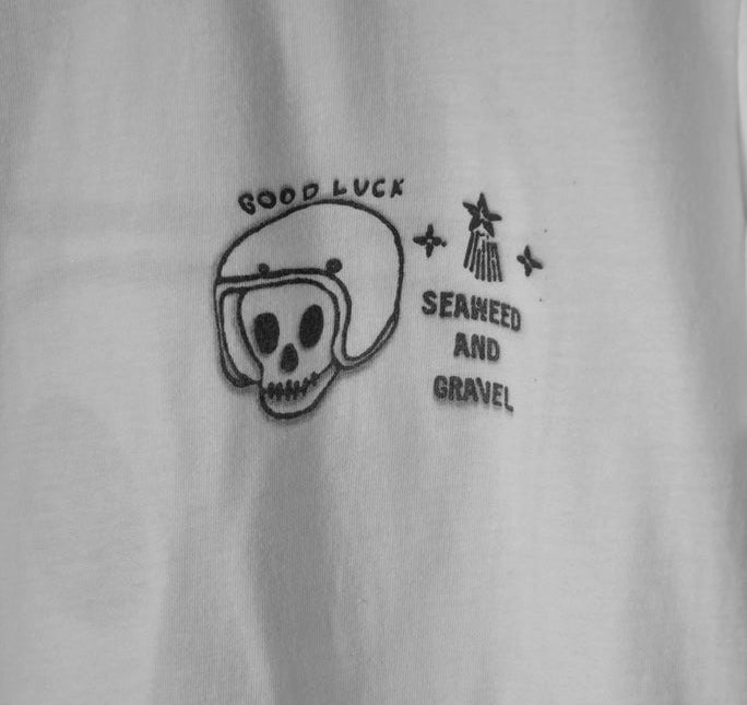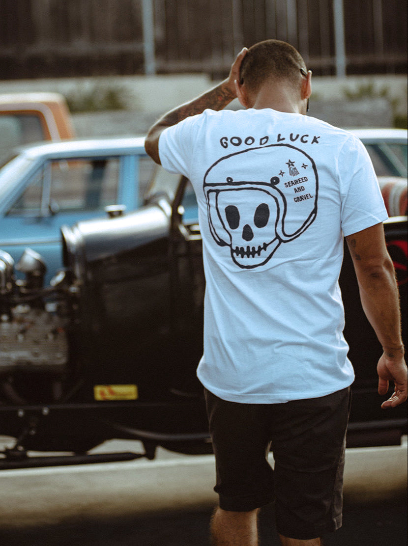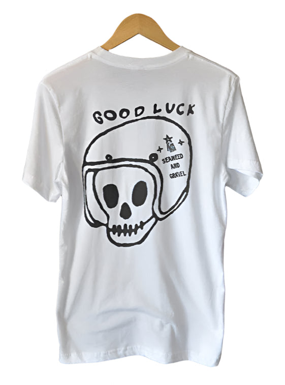 Original "Good Luck" Motorcycle Shop T-Shirt in White.