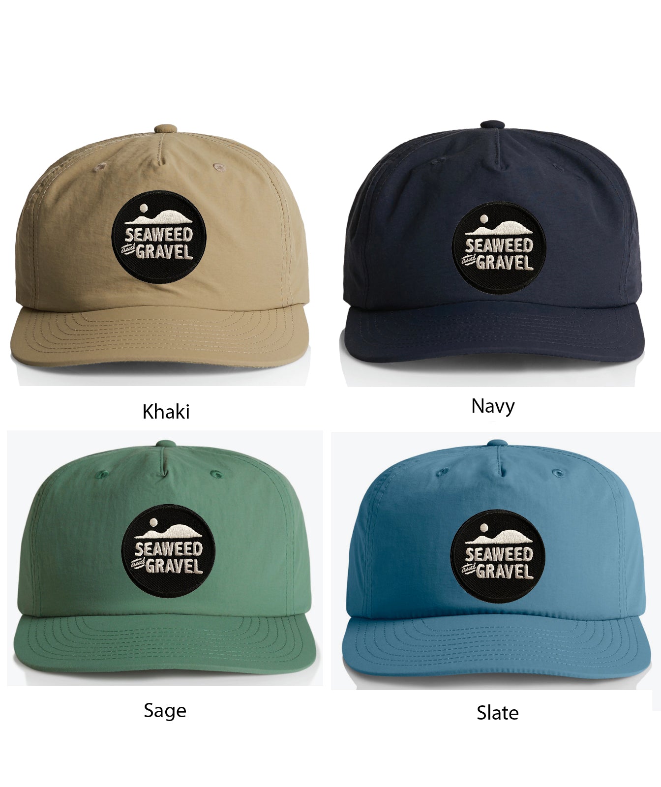 Nylon adjustable cap with flat visor and Black Hills Seaweed and Gravel Patch. Crushable and water friendly! This is our favorite cap and our customers favorite, easily washable and never looks worn.